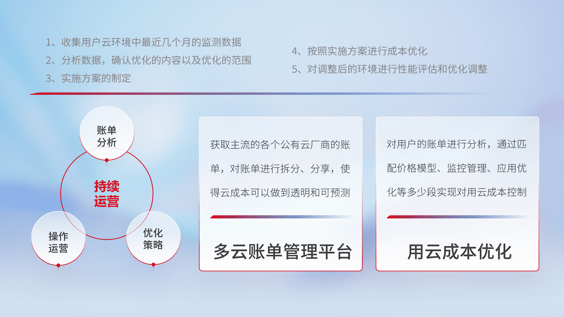通过多云纳管,,以统一的资源数据模型把客户的云资源进行抽象和封装,,进而实现对多云资源的统一操作,,,保障云资源管理的可靠性、、、、稳定性与可用性。。。量身定制化运维内容,,,,配置、、、开发运维、、补丁管理、、、备份、、、监控、、、、认证和访问管理、、、审计和日常巡检等,,保障在用云过程中的可靠度,,,,稳定度以及高可用率。。。。