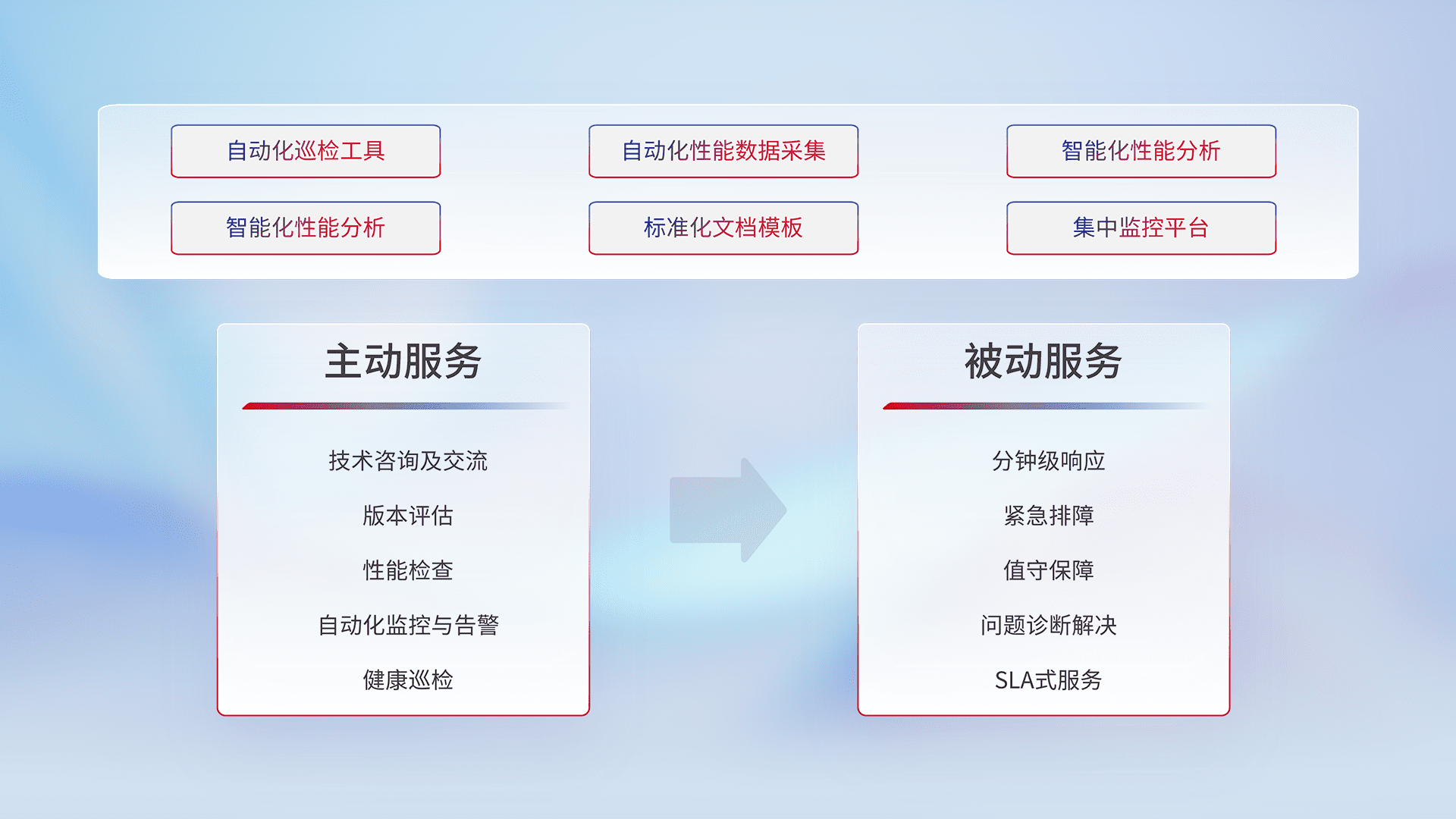 智能化工具和标准化文档,,,保障服务质量,,,,提供主动服务(包含技术咨询、、版本评估、、、、性能检查、、、自动化监控与告警、、、健康巡检)和被动服务包含(分钟级响应、、、紧急排障、、值守保障、、问题诊断解决、、SLA服务)。。