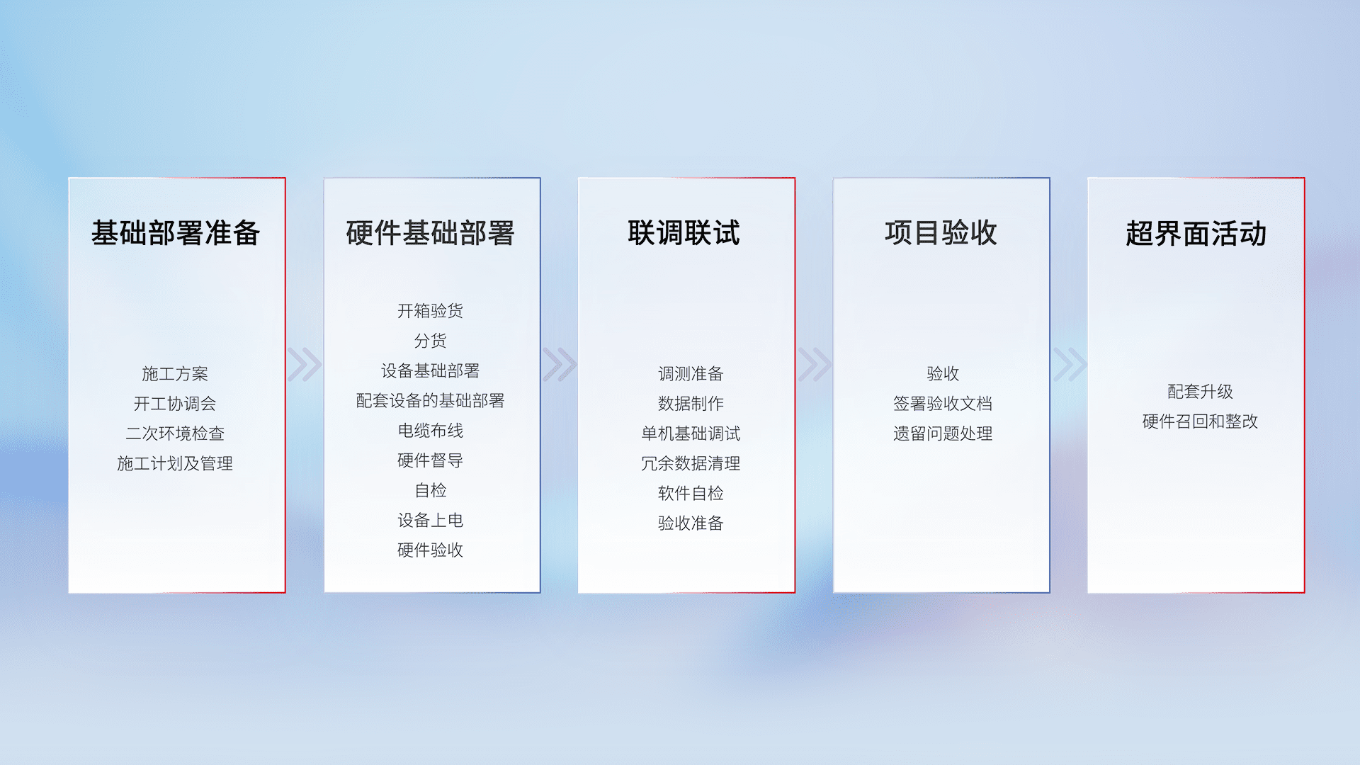 从基础部署准备、、硬件基础部署、、联调联试、、、、项目验收、、、越界面活动的全过程可追溯,,,,保证施工质量和进度。。。。
